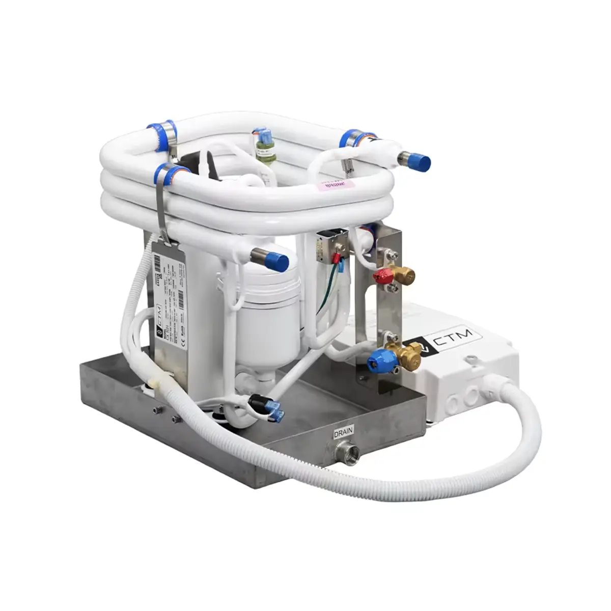 CTM CX-16H 16000 BTU Marine Split A/C Condenser 230V is a marine split condensing unit built for 208-240V, 50/60Hz operation with R410A refrigerant. It features titanium circulating coils, stainless steel hardware, corrosion-resistant construction, and compatibility with several major marine A/C control platforms.