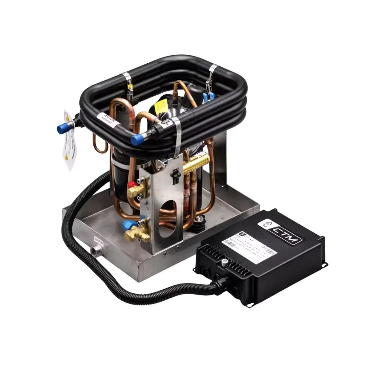 CTM CX-16S 16000 BTU Marine Split A/C Condenser 115V is a marine split condensing unit designed for 100-120V, 50/60Hz operation and R410A refrigerant, with the added benefit of soft start capability. This 16,000 BTU model is built for buyers who need a higher-capacity split-system marine A/C condenser with corrosion-resistant construction, including titanium circulating coils, stainless steel bolts, and a stainless steel structural pan.