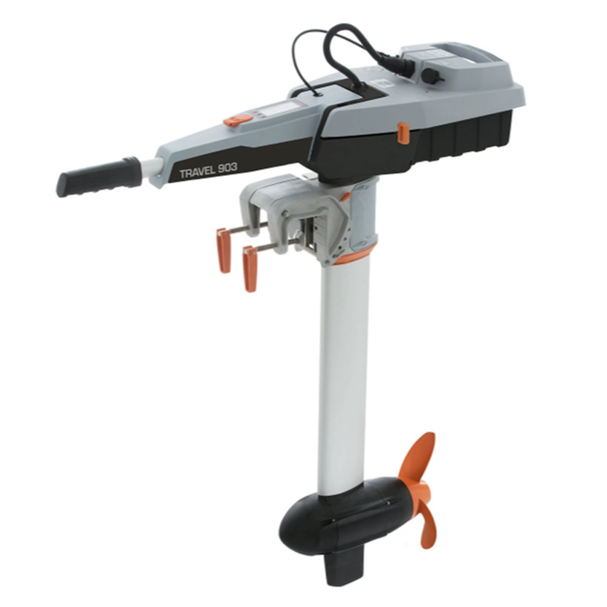 The Torqeedo Travel 903 L is a 900W long-shaft electric outboard motor designed for sailboats and boats with deeper transoms, offering silent and emission-free propulsion.
