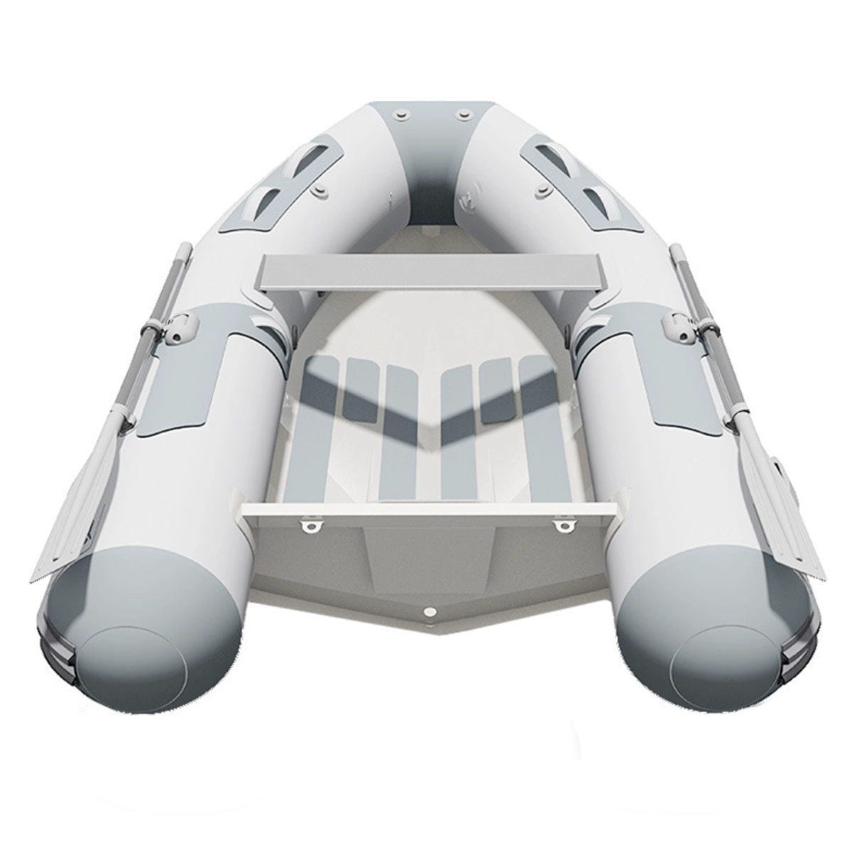 This inflatable boat combines Aluminum V-Hull and Strongan 1200 PVC, 1100 dtx in its published construction details. Those details, including 16" tubes and 3 air chambers, help explain its balance of stability, durability, and ride control.