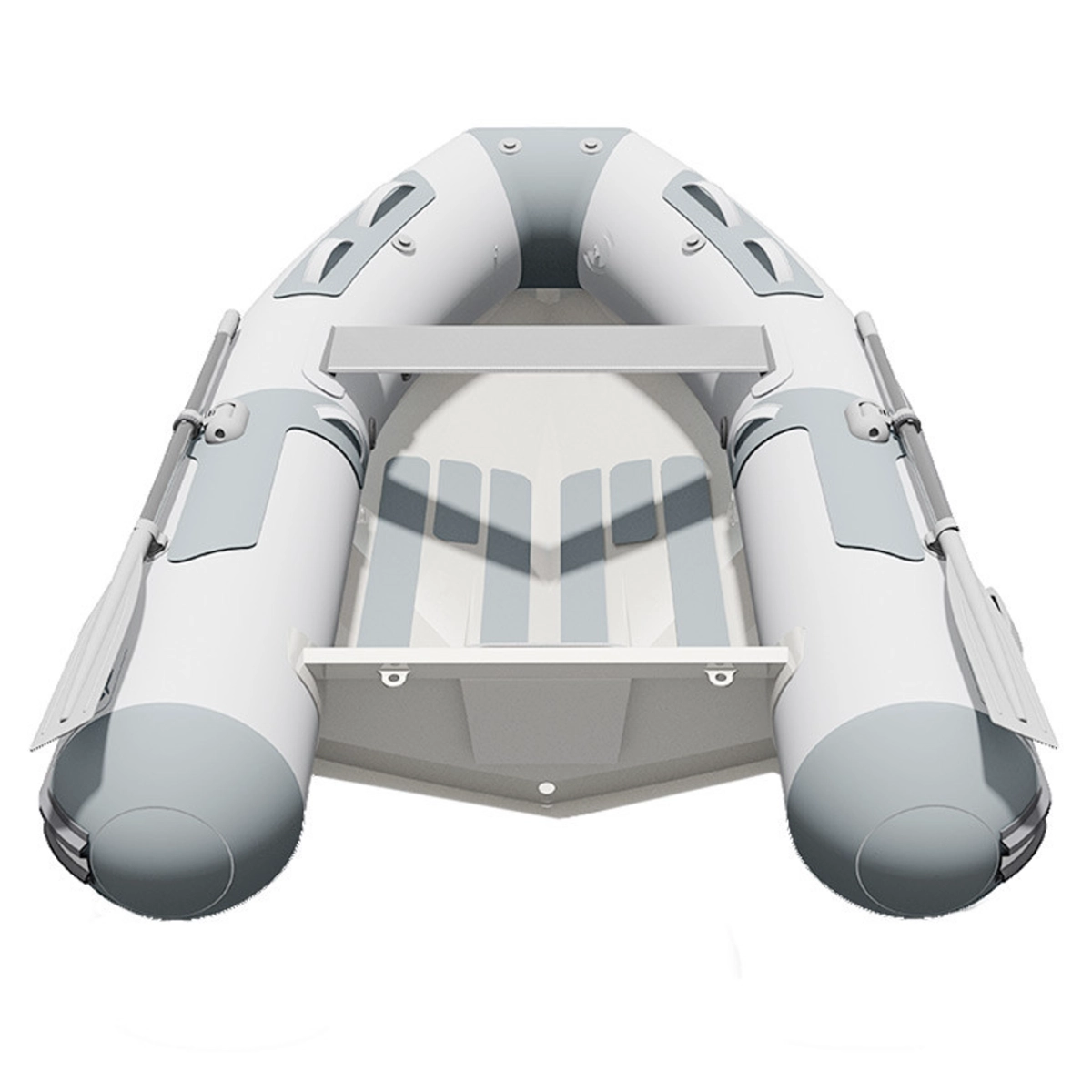 This inflatable boat combines Aluminum V-Hull and Strongan 1200 PVC, 1100 dtx in its published construction details. Those details, including 16" tubes and 3 air chambers, help explain its balance of stability, durability, and ride control.